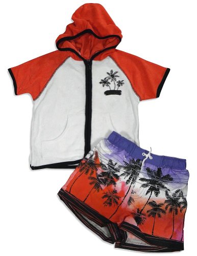 Baby Buns - Infant Boys Island Swimsuit And Coverup Set, Red, White, Black, Island Print Swimsuit, Full Elastic Waistband, Decorative Tie, Mesh Liner, Terry Cloth Hooded Coverup, Zipper Front, Split Pockets, Contrast Stitching, Ribbed Trim, Swimsuit 100% Polyester Coverup 80% Cotton 20% Polyester, #25314